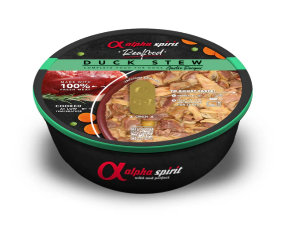" data-description="Alpha Spirit Realfood Complete Duck Stew = a hearty, all-natural dish crafted with 100% fresh meat and seasonal vegetables. This nutritious stew is designed to support your dog’s health, strength, energy levels and vitality! What makes it special? It’s made using a unique cooking method that locks in flavour and nutrients – just like a meal you’d prepare at home. Served in a convenient OPENVAC container, it stays as fresh as the day it was made, with no need for refrigeration until opened. For an extra treat, simply microwave for 60 seconds to warm it up and release even more mouth-watering flavour your dog will love.